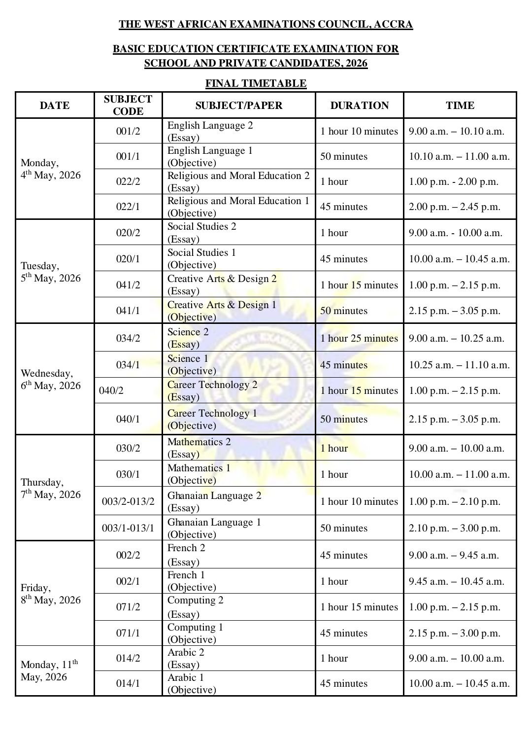 In March 2026, the West African Examinations Council released a new timetable that paired English Language with Religious and Moral Education for May 4, 2026. These two papers will usher students into the 2026 exam year on that Monday. Below is the full timetable.